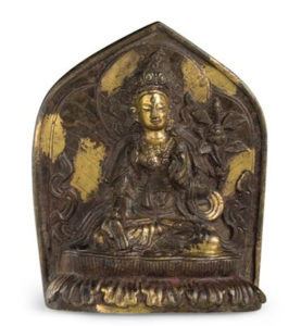 Catalogue note: The bodhisattva wearing elaborate jewellery is shown seated on a lotus base in dhyanasana with his left hand raised in vitarkamudra. The face is held in a benevolent expression, with the hair arranged in a tall chignon adorned with a foliate tiara. The back is carved with Tibetan inscriptions followed by a Daoguang cyclical date.