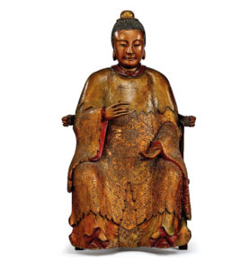 Catalogue note: She is represented sitting on an armchair. She is dressed in a dress made partly of leaves, her shoulders are covered by a capeline. Her left hand rests on her thigh, her right hand is slightly raised at the level of her chest. The expression on her face is peaceful. Her hair is combed in a bun; small restorations.