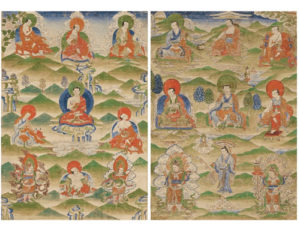 Catalogue note: These two paintings are from what was once a three-painting set depicting the sixteen arhats, the attendant Dharmatala, the patron Hvashang, and lokapala or guardian kings of the four directions. Each of these two depict six arhats, one attendant, and two lokapala. Himalayan Art Resources (himalayanart.org), item nos. 90313 and 90314.